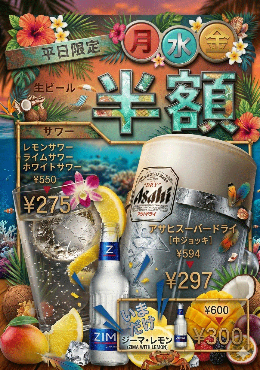 平日限定!月・水・金曜日は、生ビール、サワー<生ビール>・アサヒスーパードライ(中)ジョッキ 通常価格594円→297円(税込)<サワー>・レモンサワー・...