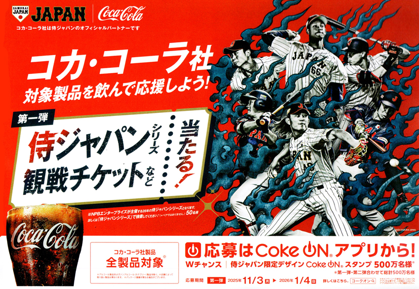コカ・コーラゼロを始めとするコカ・コーラ社製品を飲んで侍ジャパン応援グッズ等を当てよう!応募はCOkeONアプリから!※応募にはCOkeONアプリの登録が必要になります。※チケットを1枚お渡しします。裏面のバーコードをCOkeONアプリから読み取って応募して下さい。